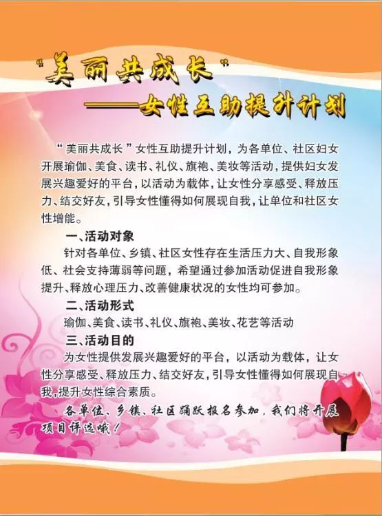 如果您有特长,有意志愿参与“美丽共成长”女性素质提升项目,请联系我们;