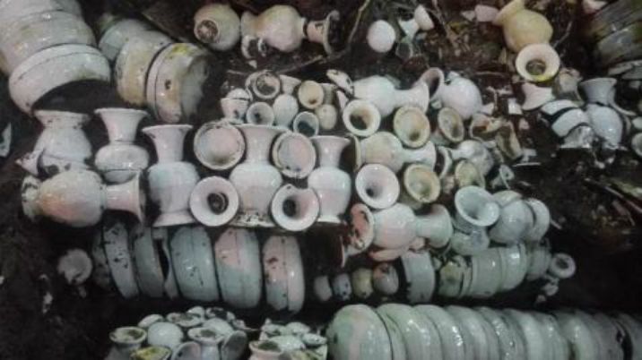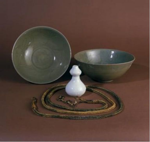 打捞出的青釉碗、德化窑白釉瓶、金腰带