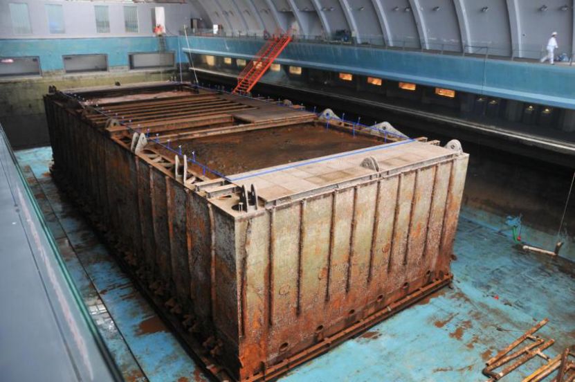 水下的环境,每10米会增加一个大气压力,南海一号在海下埋了800多年,等于要承受14倍的大气压力。我们打捞上岸后,会改变海底恒温的环境,海水的腐蚀性也非常强,因此保护工作特别重要。 我们根据力学计算,沿沉箱外侧设置了两排、共22个支撑立柱的桁架平台,桁架可以加固沉箱本体,并为考古发掘平台提供支撑、建设运输、照明、通风等依托。 但是从2007年整体打捞上岸到发掘船内文物工作开展,已经过了8年,达到平台使用寿命的限制,因此各种安全项目都需要不断检测。
