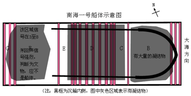 古代的船只遇到海难时,会在到达稳定的海泥层时停止下沉,船的表面会很快形成海泥,埋藏在海床之下。 我们国家沿海多为泥地,对于沉船有利也有弊,好处是泥沙层的堆积会形成天然保护,沉船不容易发现也不会再受到海洋潮汐冲刷。一般我们国家都是半日潮,每天会有两个高平潮和两个低平潮(海水的涨潮和退潮),如果沉船暴露在海底的话,会被大量的泥沙反复冲刷,例如我们在西沙发现的“华光礁沉船”,船只一直裸露在外,被泥沙海水冲刷,因此打捞出来的瓷器表层釉面多已磨损。 南海一号埋藏在海床之下,客观环境保护了船体。 我们采用“地层剖面仪”和“双频声呐”对沉船进行了初步探测,在沉箱四周,每隔30公分进行分区(A—G区域)探测。测量后发现,船艏、船艉已破损严重,部分船板严重腐朽;船艏、船舯、舷内都堆积了大小不一的凝结物;甲板上层的建筑也已解体,只有甲板下的隔舱、船体支撑结构保存尚可,因此船舱内的货物仍相对完好。