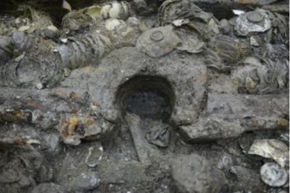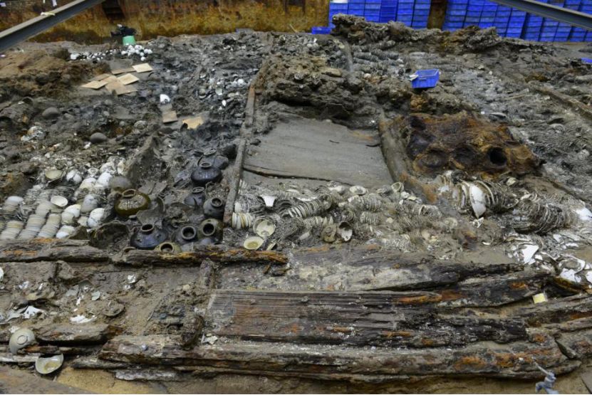 我们将表面泥沙揭开以后发现,每一个船舱装的货物不同,每个货物都有很复杂的包装,兼顾了运输安全和节约空间两方面。