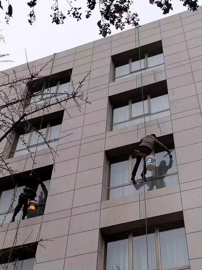 图右为李世增正在进行高空户外清洁工作