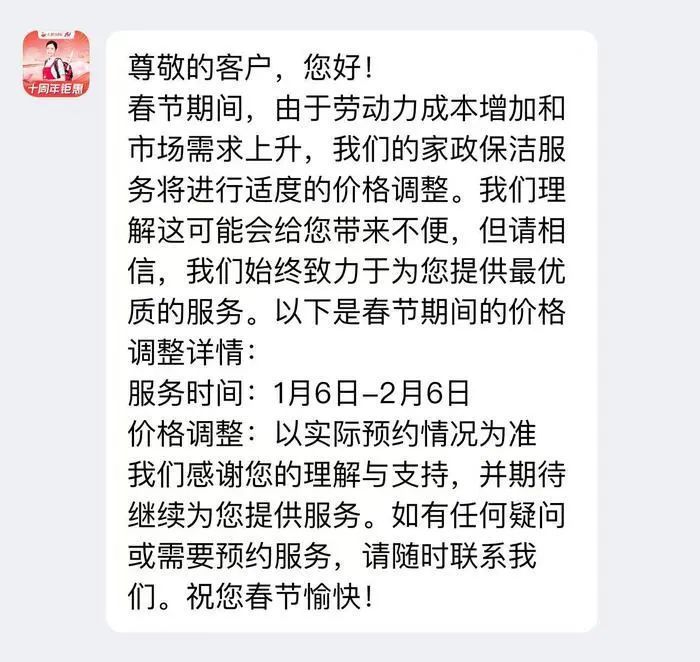 此外,部分商家在春节期间,由于劳动力成本增加和市场需求上升,家政保洁服务将进行适度的价格调整,其中天鹅到家在1月6日到2月6日春节期间进行价格调整,客服回应称最终价格以实际预约情况为准。