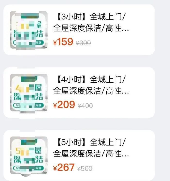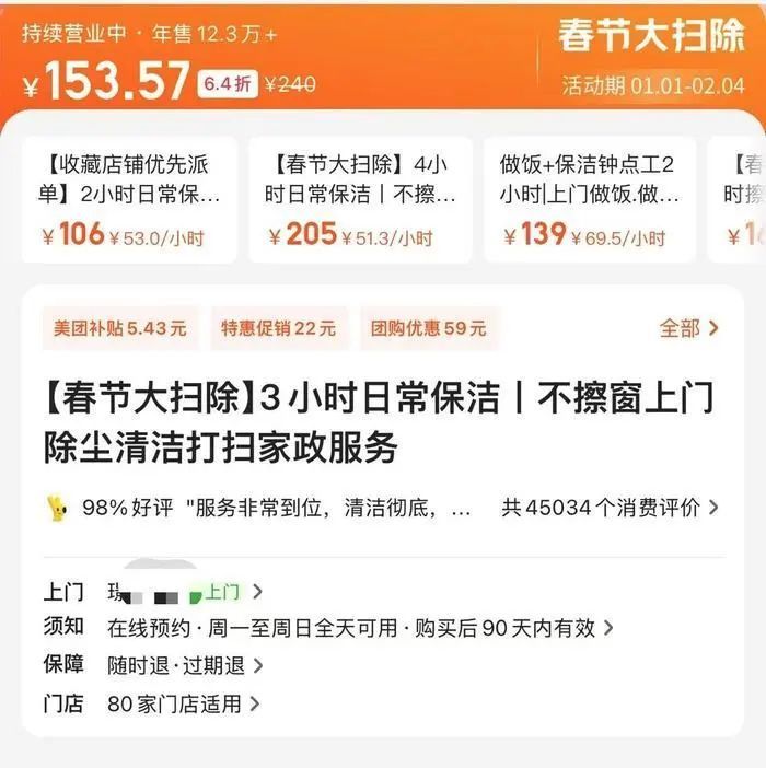 记者在团购平台搜索家政清洁,多个团购价格显示确实有较高的性价比。例如,日常清洁服务每小时的价格通常在50元、60元、70元不等,以60/每小时为例,4小时直接购买价要240元,而团购价格只需要209元,团购价格可节省几十元。