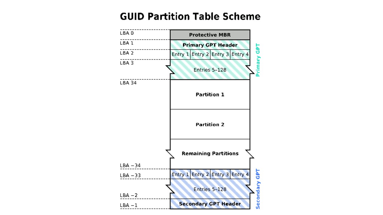 MBR有一些陷阱。首先,硬盘中只能有4个分区,每个分区的大小限制为2TB。对于具有100TB大存储空间的硬盘,这不能很好地工作。其次,MBR是保存分区信息的唯一位置,如果曾经损坏过(是的,它很容易损坏),则整个硬盘都不可读。