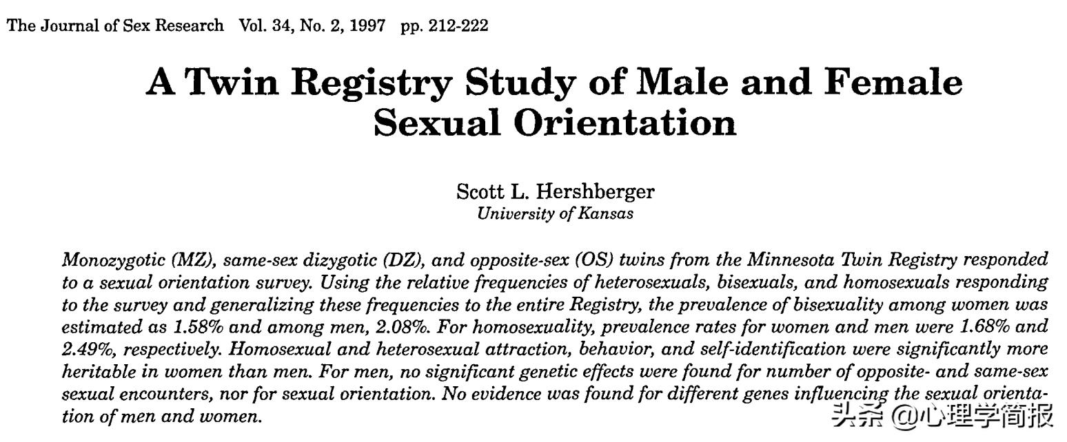 在性取向成因的基因假说中,最具影响力的一个实验来自于美国堪萨斯大学(University of Kansas)的心理学教授Scott L Hershberger在1997年对同卵双胞胎(monozygotic twins)的研究,该研究成果于1997年发表于期刊Journal of Sex Research。(文献题目及摘要截图如下)