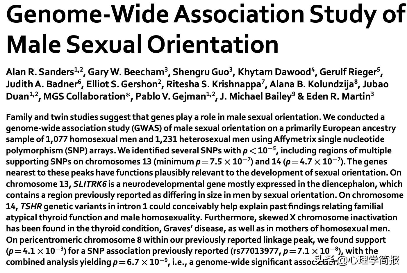 最新的研究中,美国芝加哥大学(University of Chicago)的Alan R. Sanders教授团队在2017年的研究中通过基因标记的方法SNP(single nucleotide polymorphism )测试了男性性取向与染色体的关系[5]。该研究结果于2017年发表在期刊Scientific Report。(文献题目和摘要截图如上所示)