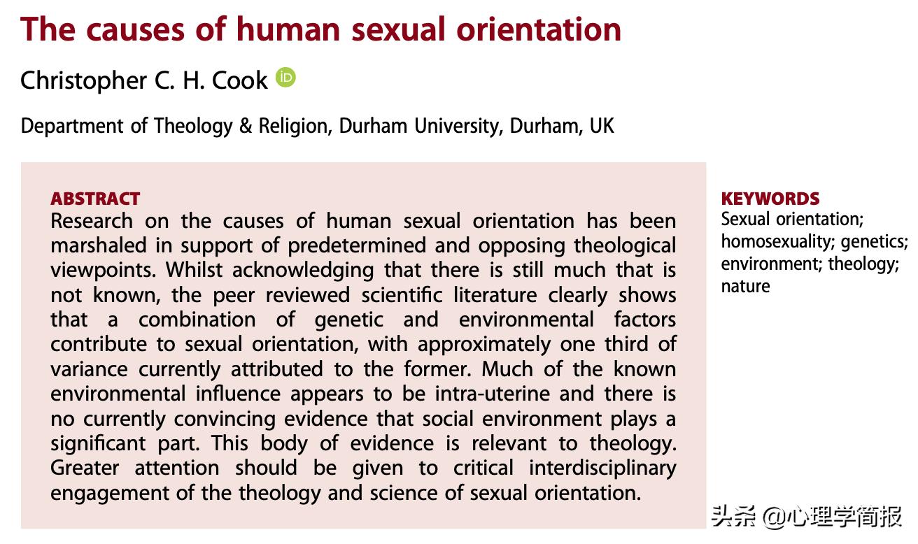 为了回答这些问题,我们参考了英国杜伦大学(Durham University)心理学家Christopher C. H. Cook教授在2020年的最新综述中总结了性取向成因的相关问题,因此,我们将重点参考这项最新的文献为读者们解读上述问题。(文献题目和摘要截图如下图所示)