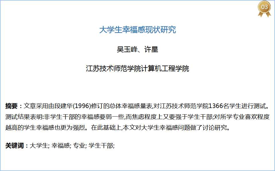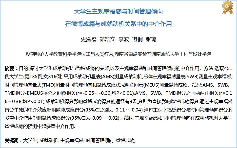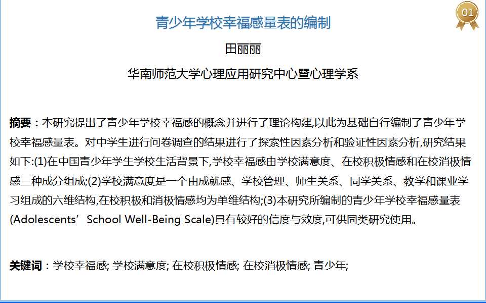 总体幸福感量表(General Well-Being Schedule Scale,简称GWB量表)由Fazio(1977)提出,是为美国国立卫生统计中心制订的一种定式型测查工具,用来评价受试对幸福的陈述,原始量表共有33条目。
