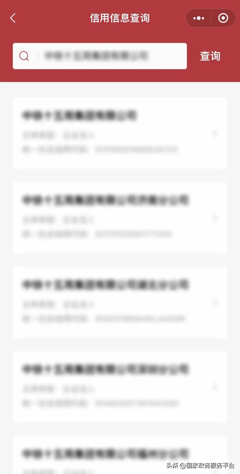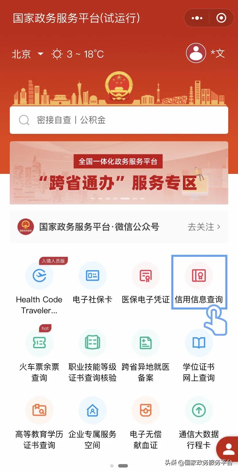 点击下方葵花码或微信搜索“国家政务服务平台”,进入小程序,首页找到信用信息查询服务;
