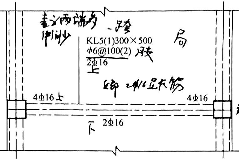 梁的中间下部标注的2∮16是两根通长下部钢筋。先看左跨梁,“4∮16”表示在梁的左端上部,配置四根HRB335级直径为16mm的钢筋。这四根钢筋担负左端部荷载引起的负弯矩(钢筋抗拉),包含两根通长筋,另外两根是直角形钢筋。中间柱附近的4∮16包含两根通长筋,中间柱的左方写有“4∮16”,柱右方什么也没有写,说明右方钢筋的规格和数量和左方是一样的,包含两根通长筋以外,剩下的是两根直形钢筋,起着同样抗负弯矩(钢筋抗拉)的作用。