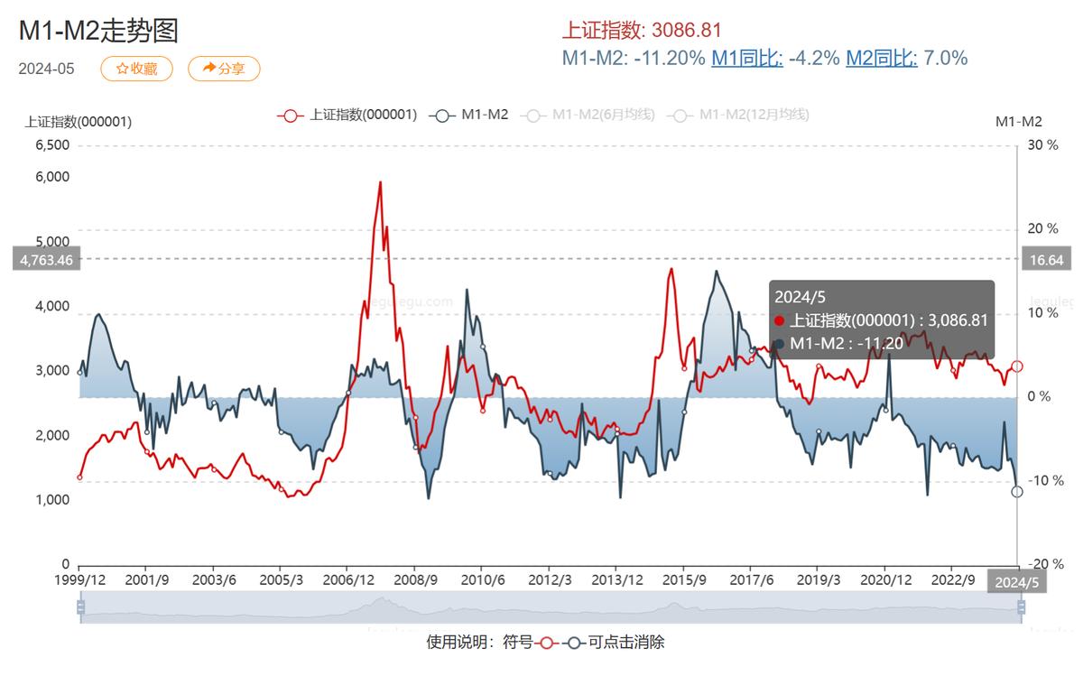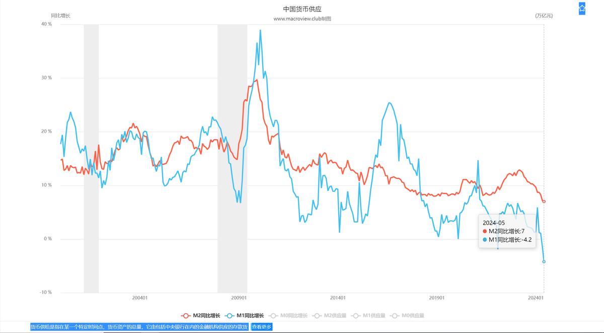 截止2024年5月,M2增速为7,M1增速为-4.2,剪刀差为-11.2。