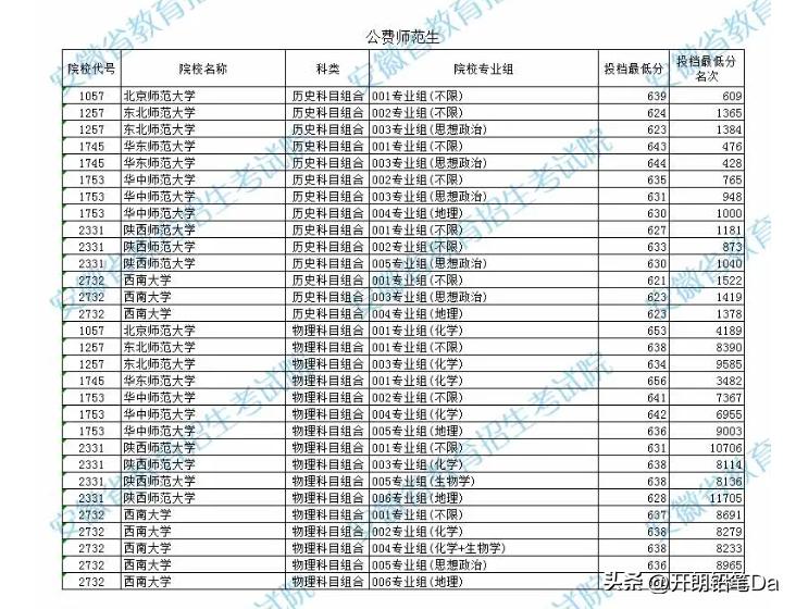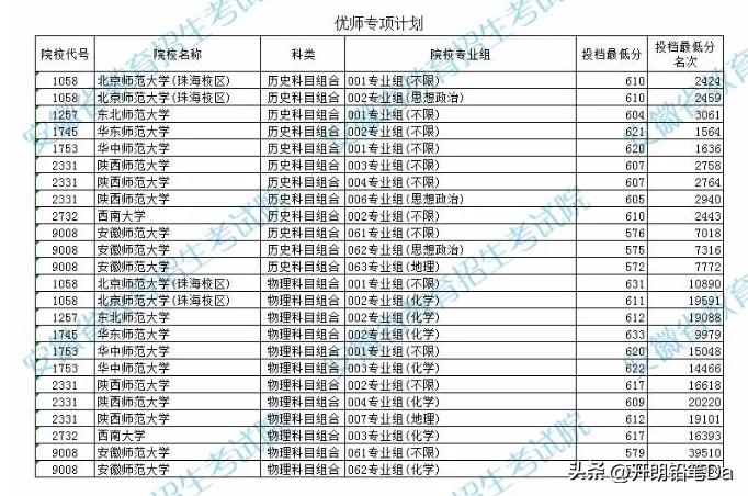 以国家公费师范生在安徽物理的录取情况为例,其中北京师范大学的最低分为653,东北师范大学的最低分为634,华中师范大学的最低分为636。除了国家公费师范生,关于安徽地方公费师范生、优师专项的分数线,详见下文。