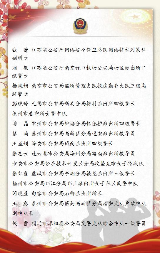 6月22日,由江苏省公安厅、江苏省妇女联合会举行的“警营‘半边天’ 奉献‘她力量’——江苏省最美巾帼奋斗者公安专榜发布”活动在省妇女儿童活动中心举行,省公安厅网络安全保卫总队网络技术对策科副科长钱蕾等12名个人和淮安市公安局经济技术开发区分局攻坚克难女子特战队等3个集体被授予江苏省“最美巾帼奋斗者”荣誉称号。副省长、省公安厅厅长刘旸,省妇联主席张彤等出席活动并为获奖人员颁奖。