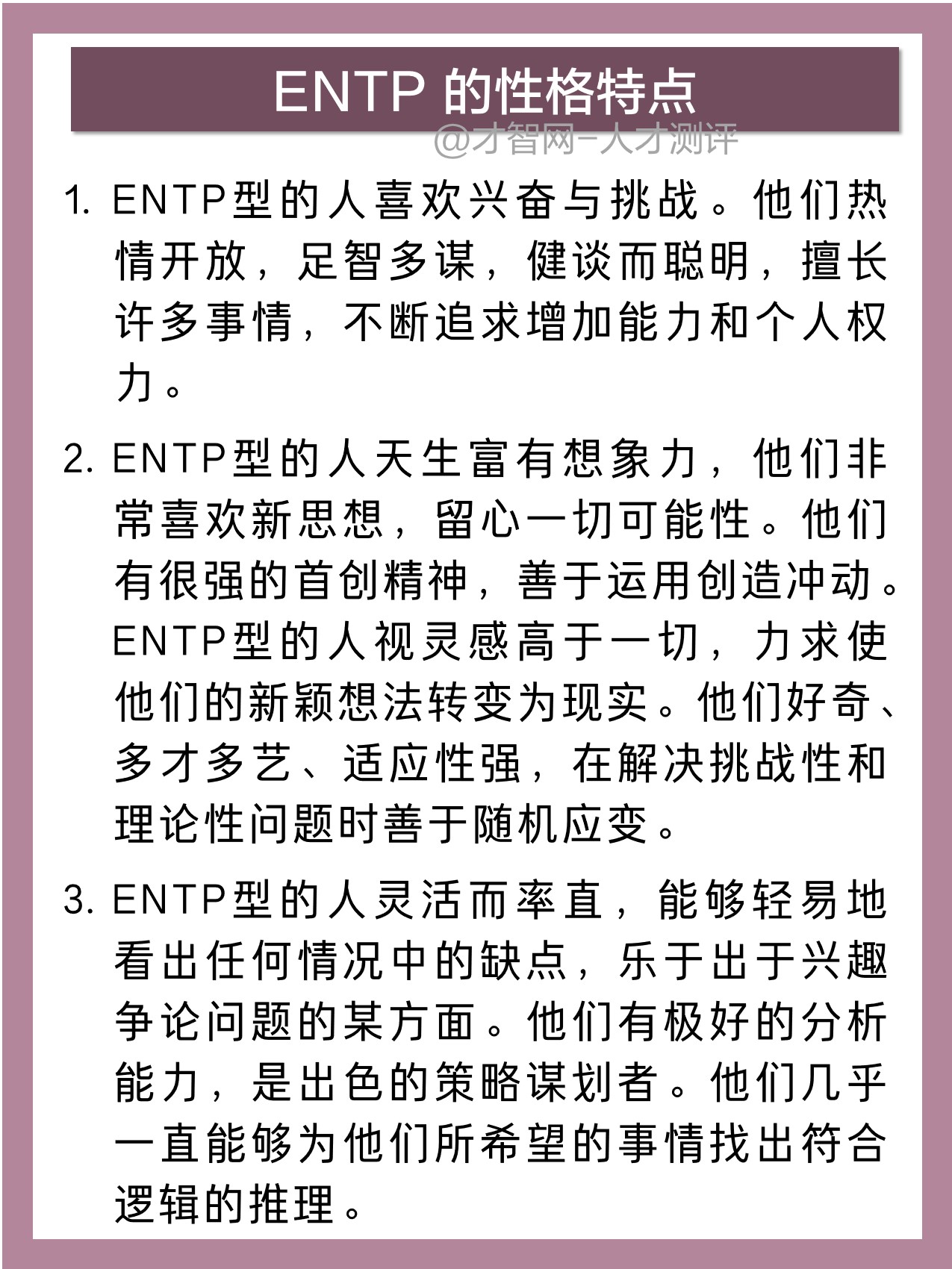 ENTP型的人灵活而率直,能够轻易地看出任何情况中的缺点,乐于出于兴趣争论问题的某方面。他们有极好的分析能力,是出色的策略谋划者。他们几乎一直能够为他们所希望的事情找出符合逻辑的推理。