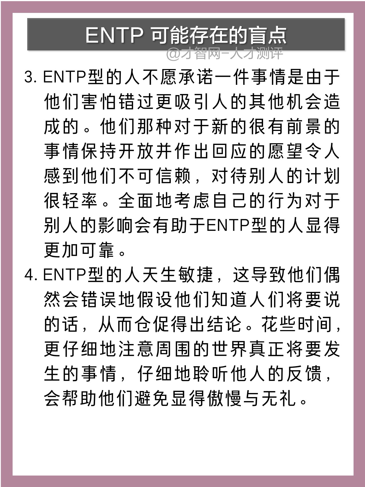 ENTP不愿承诺一件事情是由于他们害怕错过更吸引人的其他机会造成的。他们那种对于新的很有前景的事情保持开放并作出回应的愿望令人感到他们不可信赖,对待别人的计划很轻率。全面地考虑自己的行为对于别人的影响会有助于ENTP型的人显得更加可靠。