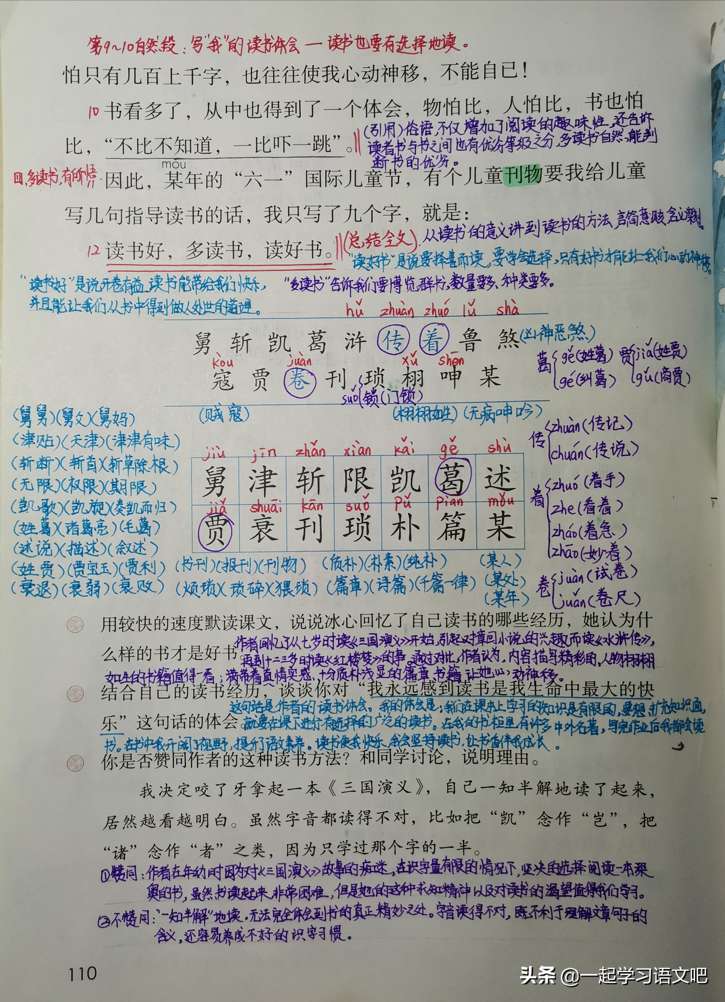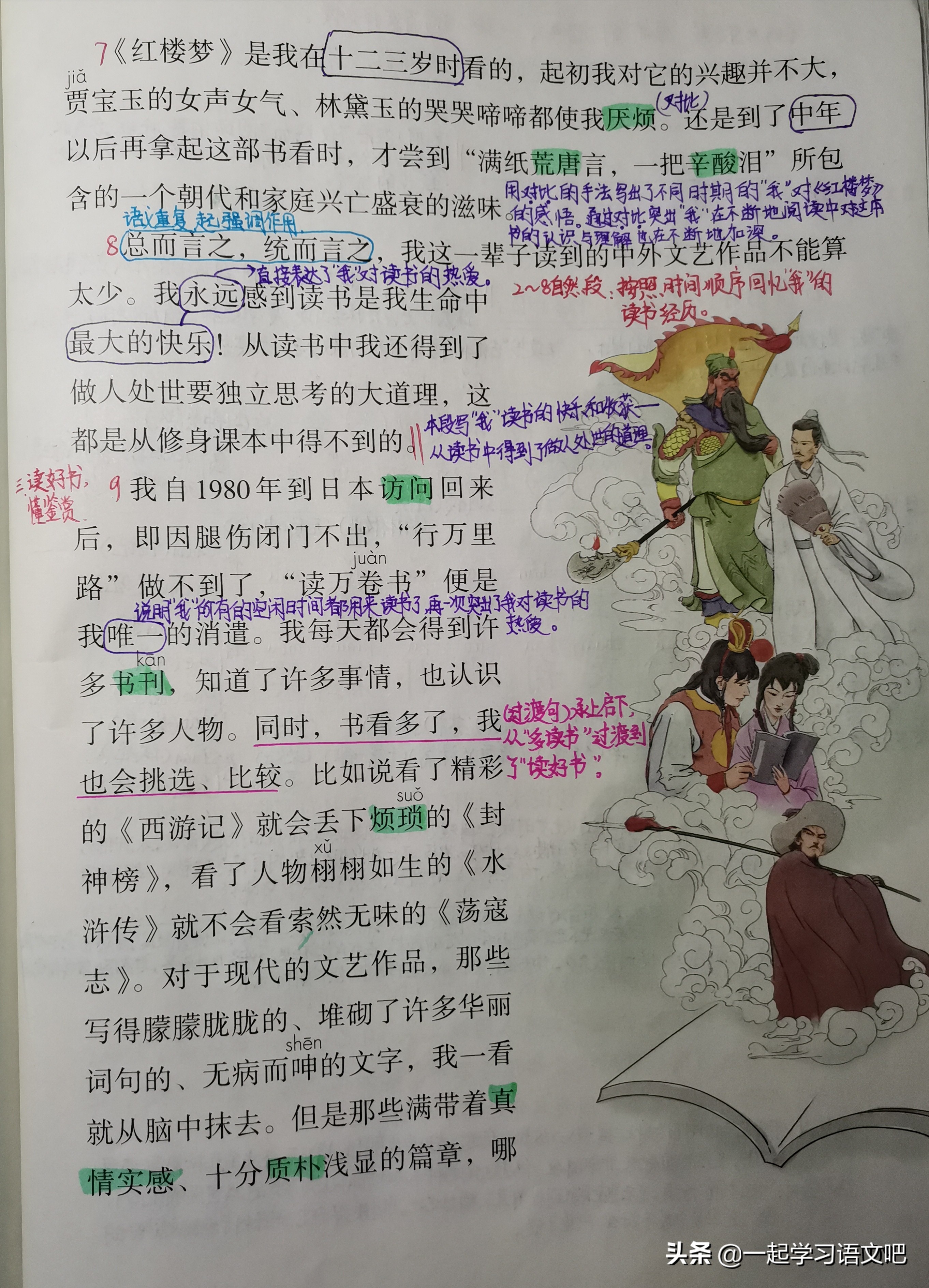 1、第9自然段,写“我”读书的喜好。“唯一”说明“我”所有的空闲时间都用来读书了,再一次突出了“我”对读书的热爱。“同时,书刊多了,我也会挑选、比较”这句是过渡句,承上启下,从“多读书”过渡到了“读好书”。