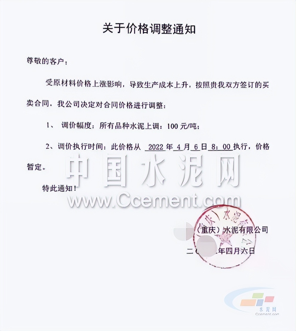 多企业发通知,水泥价格大涨100元/吨!(附涨价函)