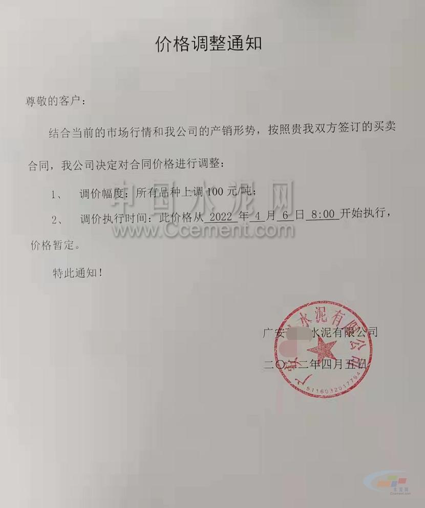 与此同时,与重庆临近的四川广安地区水泥企业也发布涨价通知称,受原材料价格上涨影响,导致水泥成本上升,4月6日起上调水泥价格100元/吨。