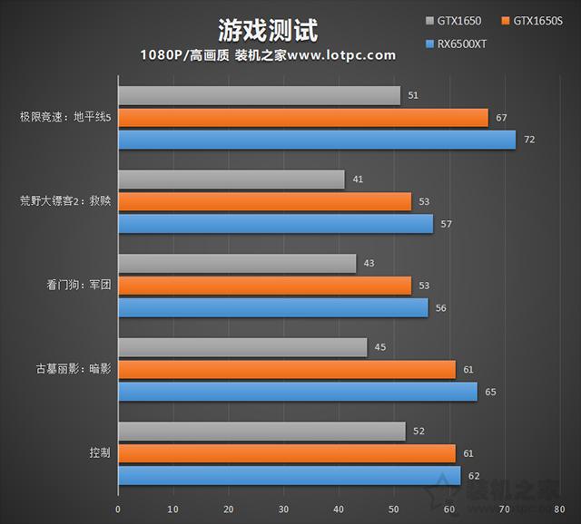 游戏实测选用了《极限竞速:地平线5》、《荒野大镖客2:救赎》、《看门狗:军团》、《古墓丽影:暗影》、《控制》几款比较吃显卡的游戏,在1080P高画质下测试游戏平均帧数,如下图所示。