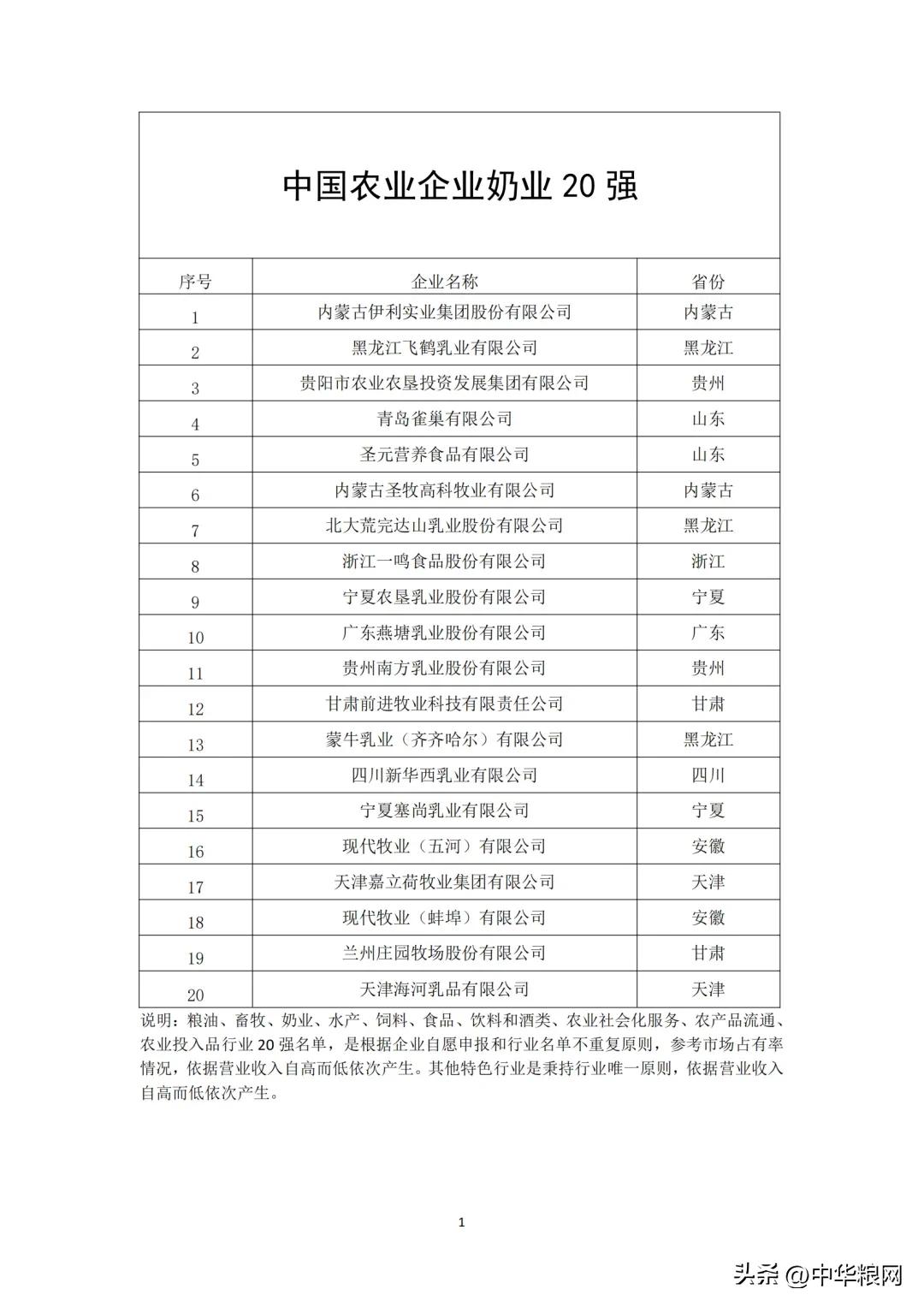 中国农业企业奶业20强