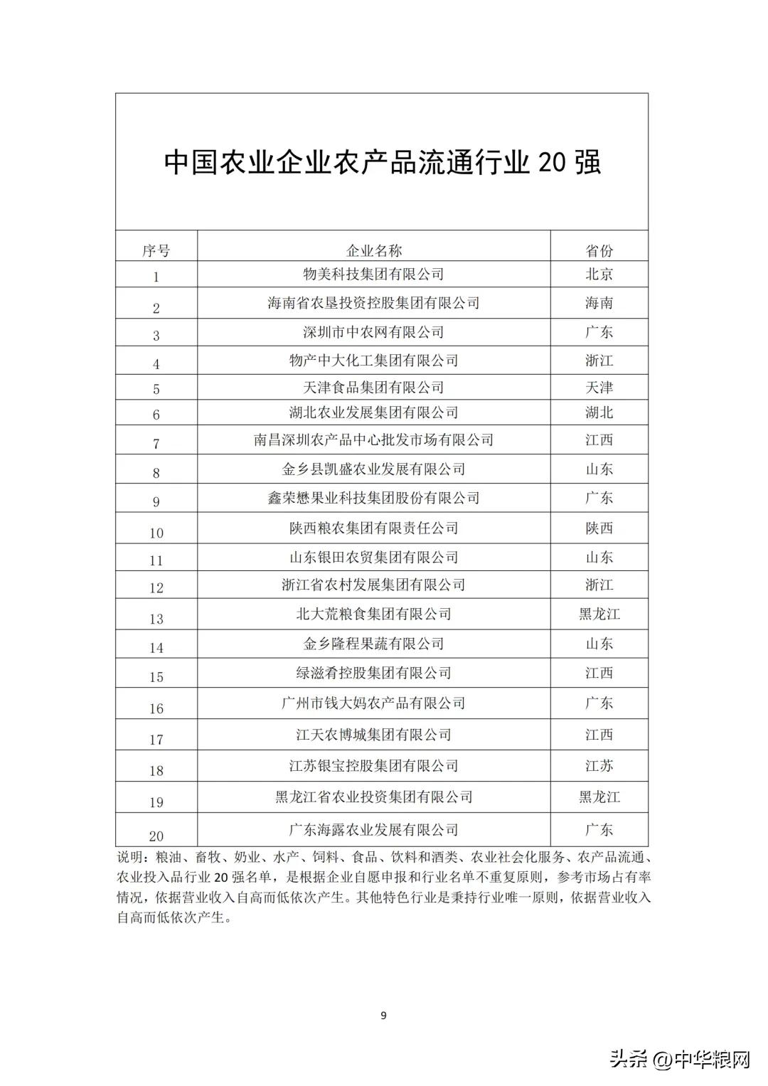 中国农业企业农产品流通行业20强