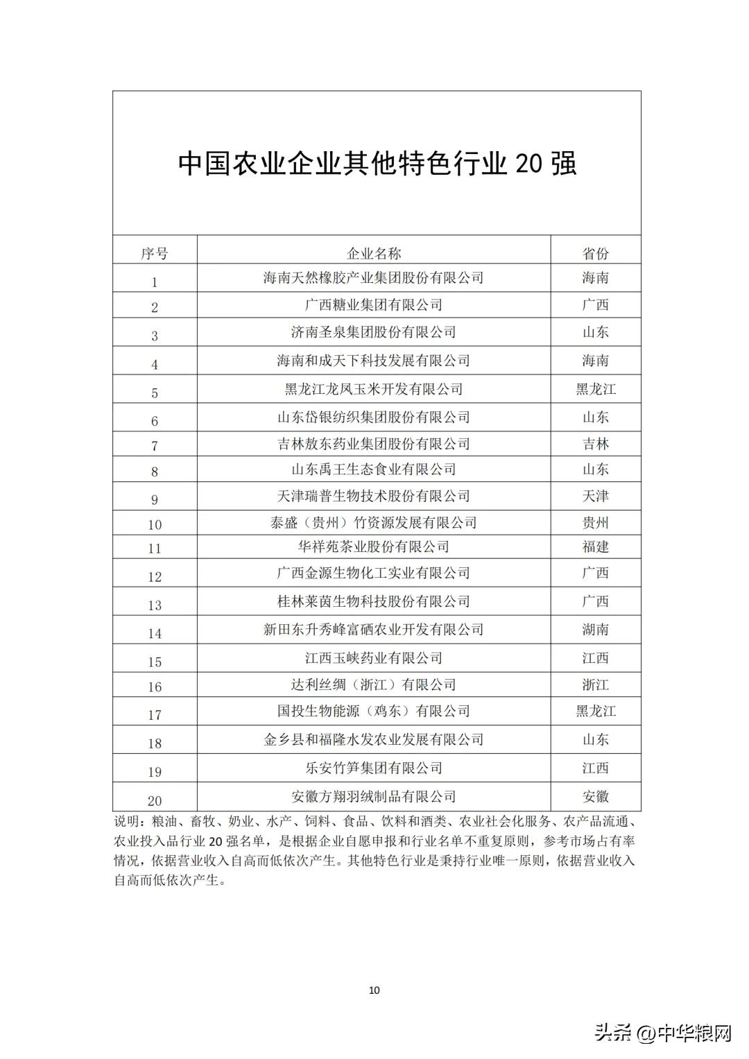 中国农业企业其他特色行业20强