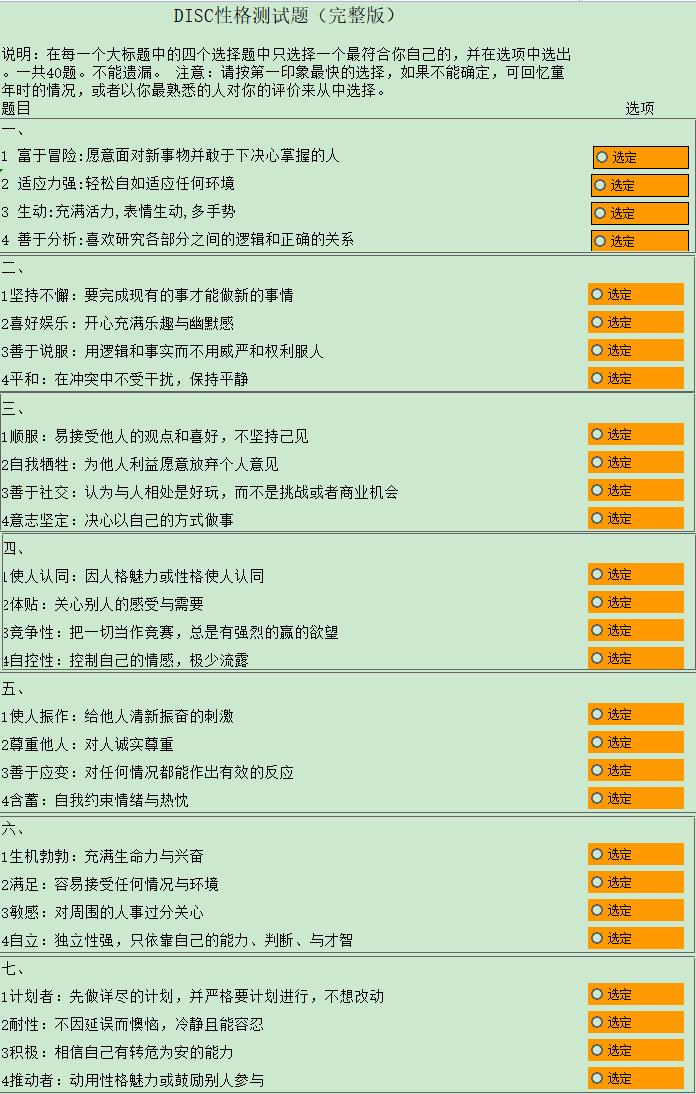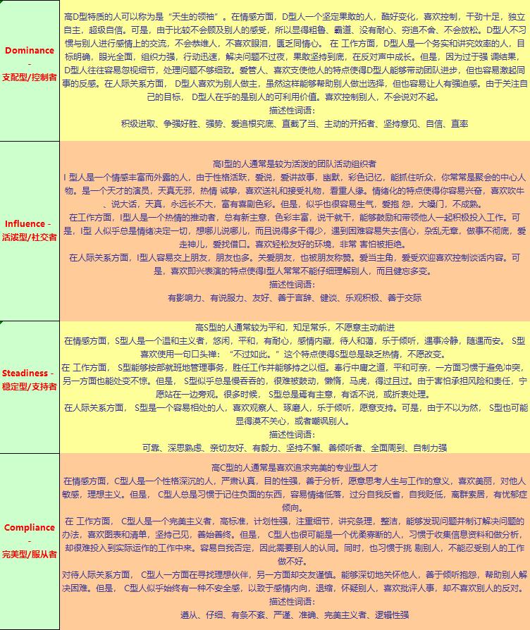 职场上火爆至今的DISC测评,目前广泛应用于与人有关的领域中,它是由24组描述个性特质的形容词构成,每组包含四个形容词,这些形容词是根据支配性(D)、影响性(I)、服从性(C)、 稳定性(S)。