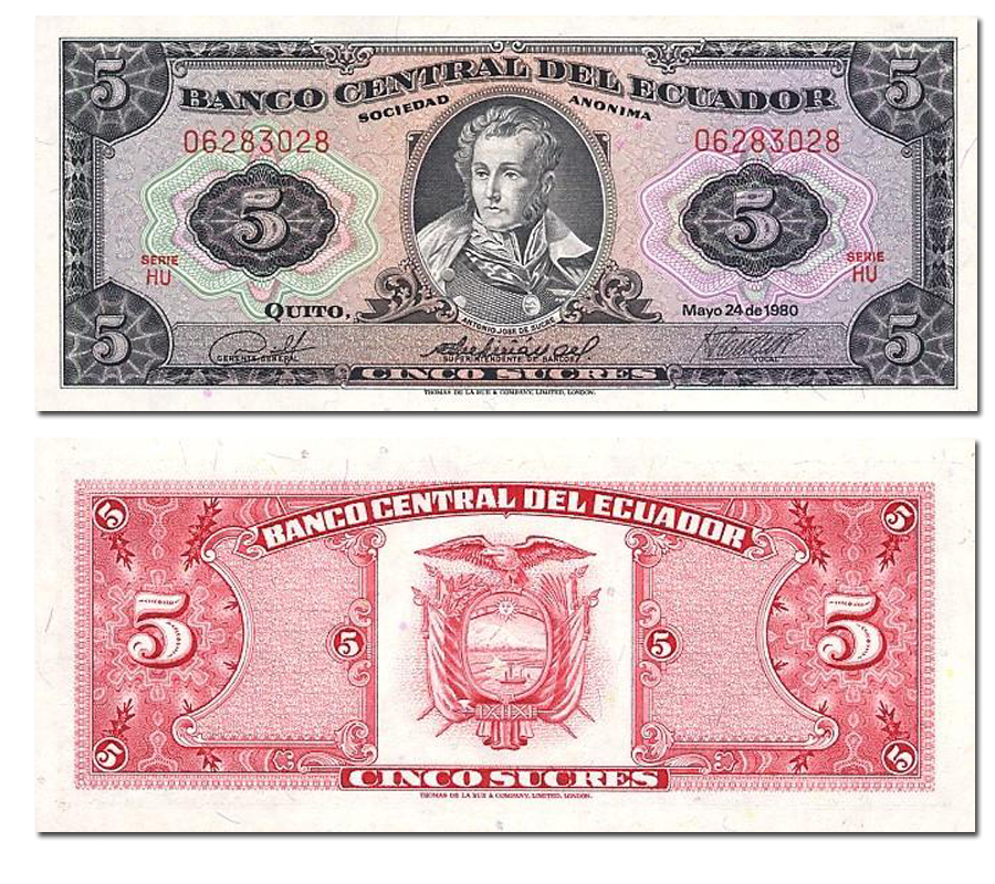 正面人物:苏克雷将军。 背面图案:厄瓜多尔国徽