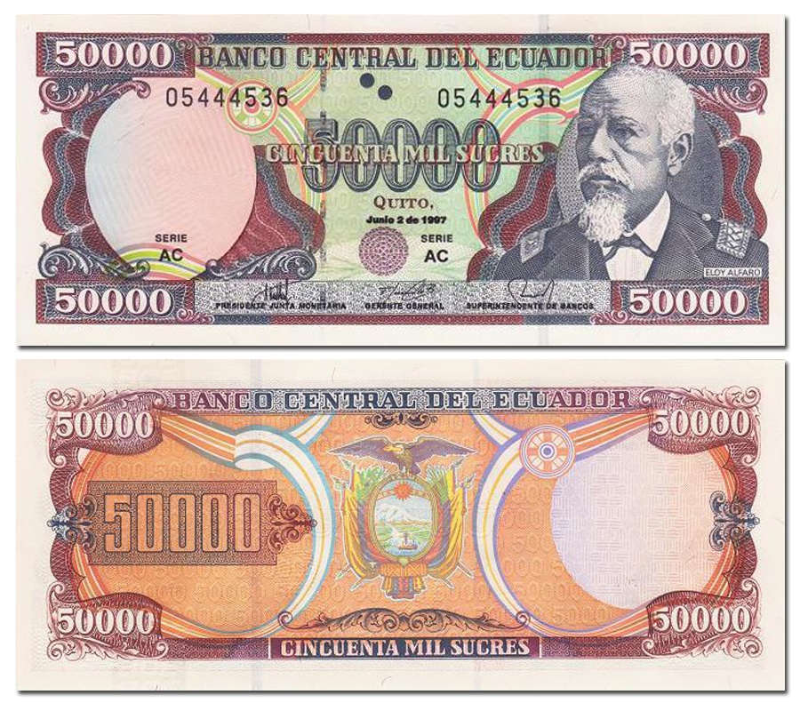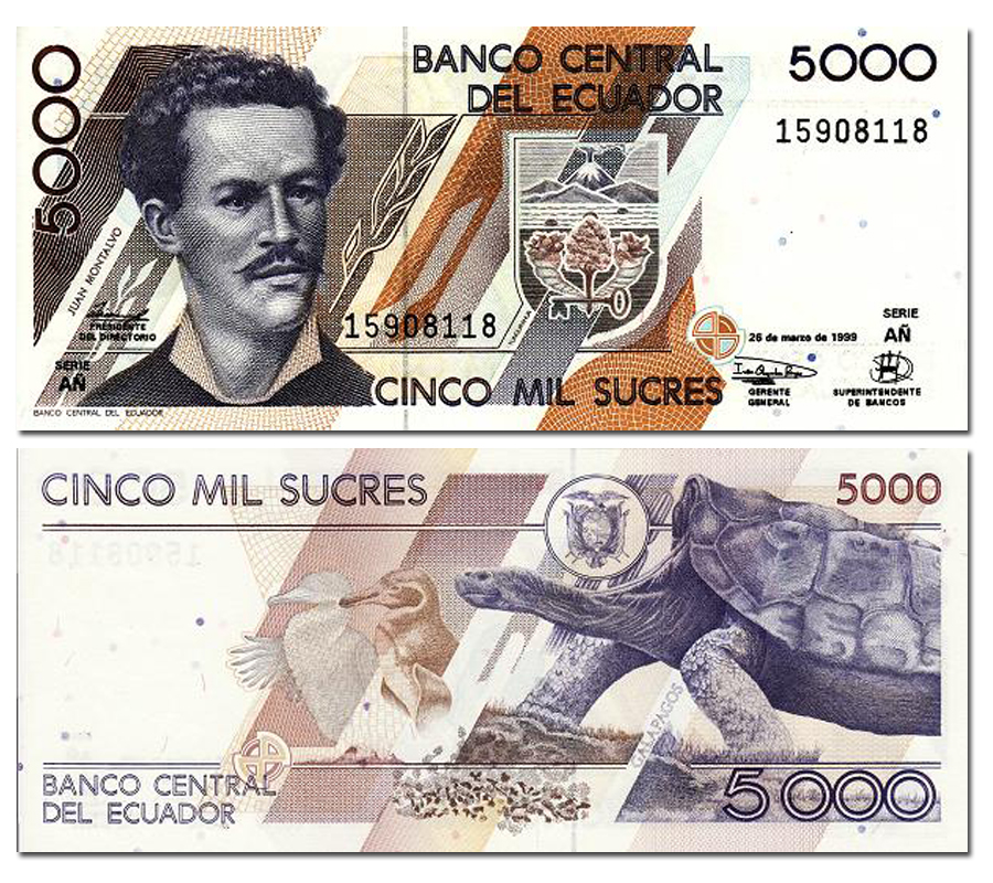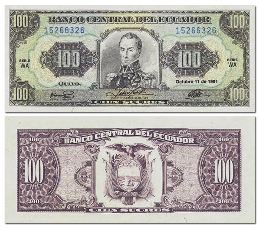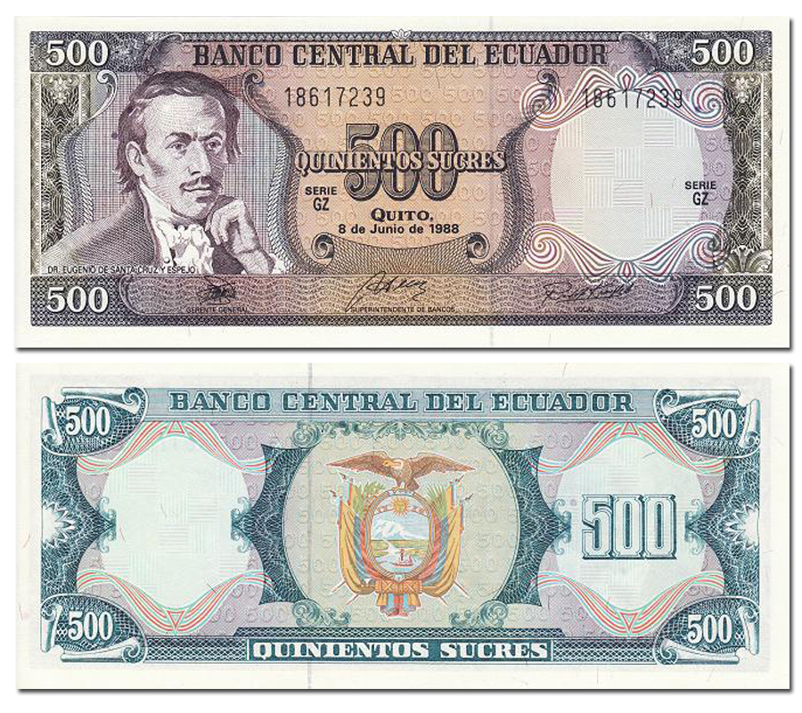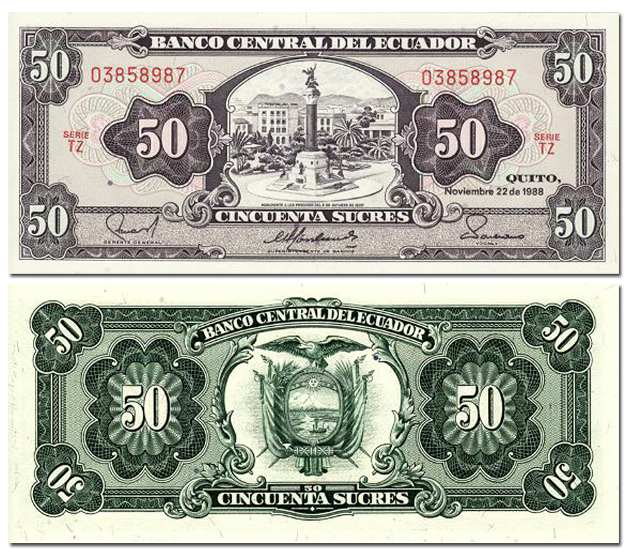 我拥有的第一张外国货币(小时候从马路上捡到的)。在90年代国内很多骗子用这个国家的钱冒充美元骗老太太。这个货币就是厄瓜多尔-苏克雷。