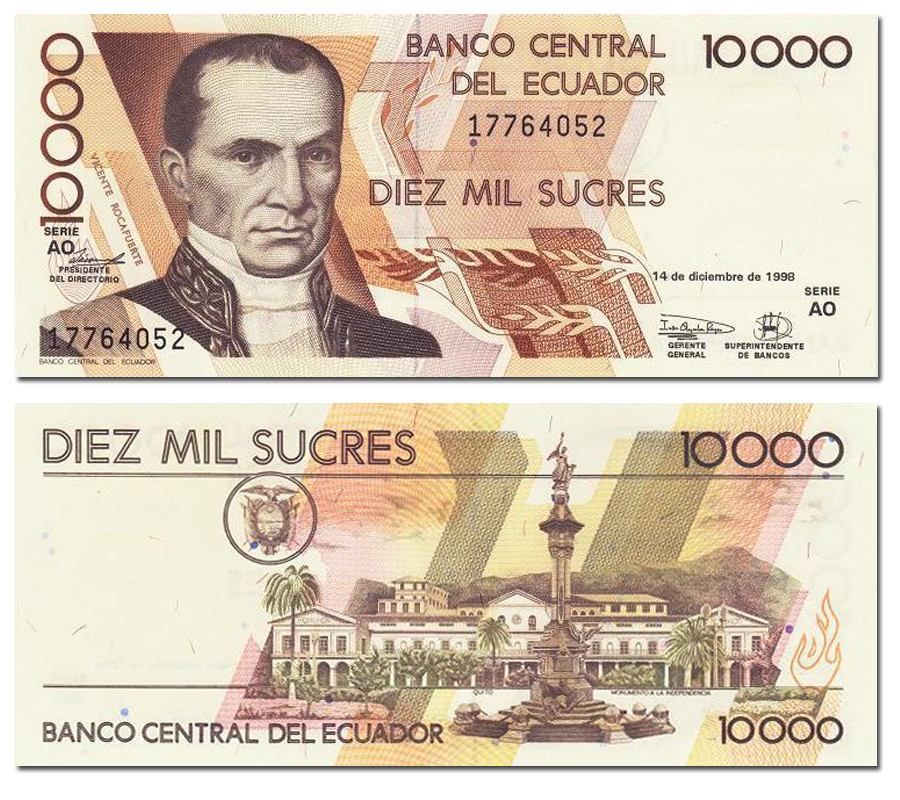 厄瓜多尔苏克雷已经介绍完了。这套货币已经停止流通了。1999年间,厄瓜多尔苏克雷疯狂贬值,在2000年1月9日,总统哈米尔·马瓦德宣布厄瓜多尔将采用美元作为官方流通货币,2000年3月13日起,美元正式成为厄瓜多尔的法定货币,当年9月11日苏克雷正式停止流通。本国货币对一个国家而言是一种主权象征,用美元来取代本国货币,损害国家和民族的尊严,也伤害到国家公民的自豪感。