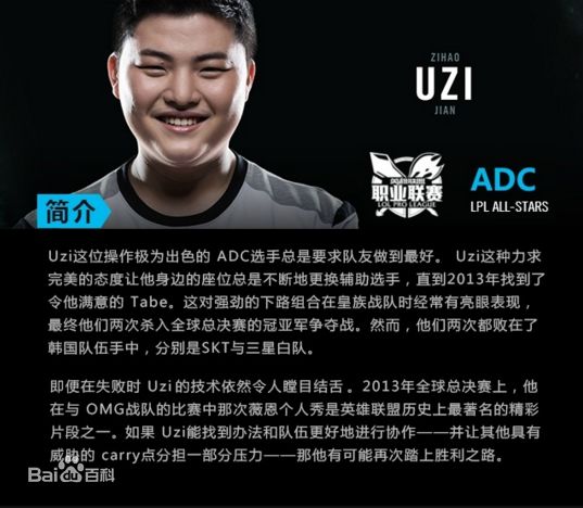 个人介绍:游戏《英雄联盟》中国区的电竞职业选手,原SH皇族电子竞技俱乐部ADC选手,现效力RNG战队并担任队内ADC一职。2013年Uzi第一次进入全球总决赛,在预选赛上使用暗夜猎手VN在比赛一战封神,却在决赛惜败SKT获得S3英雄联盟世界总决赛亚军。2014年再次进入S系列比赛获得S4英雄联盟世界总决赛亚军。2015年S5赛季初加入OMG无缘世界总决赛。春季赛结束后,在2016年夏季转会期时转会到RNG,2017年全明星宣传片:Uzi为LPL代表人物,2018年获得MSI季中赛冠军。2018年6月,入选2018雅加达-巨港亚运会英雄联盟电子体育表演项目中国代表队。