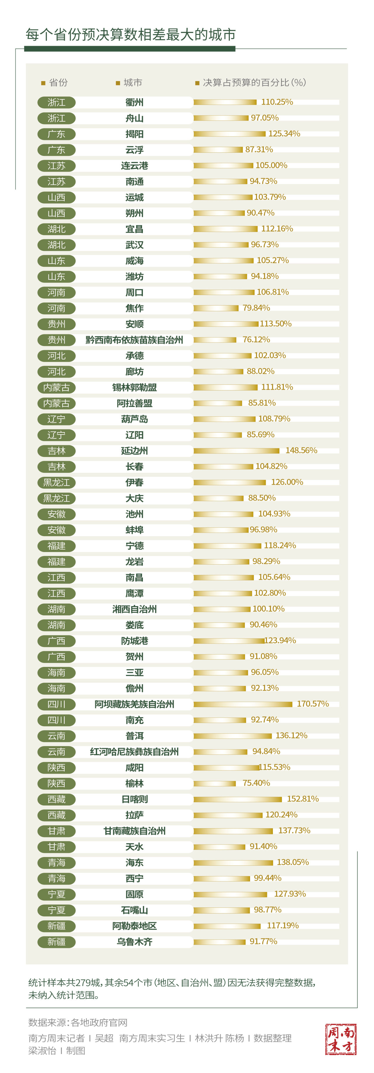 为展现更真实的预决算情况,此次统计均采用首次公布的预算数据。不过,根据现行规定,政府可以在年中逐步调整预算数据,因此许多城市预决算数据最后相差无几。