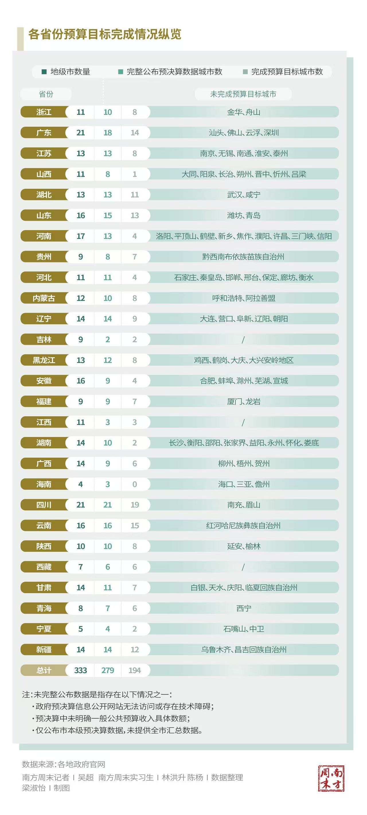 其中,海南4个地级市中,3个公布了预决算报告,均未完成目标;山西11个地级市中,8个公布了预决算报告,仅有运城完成了目标。