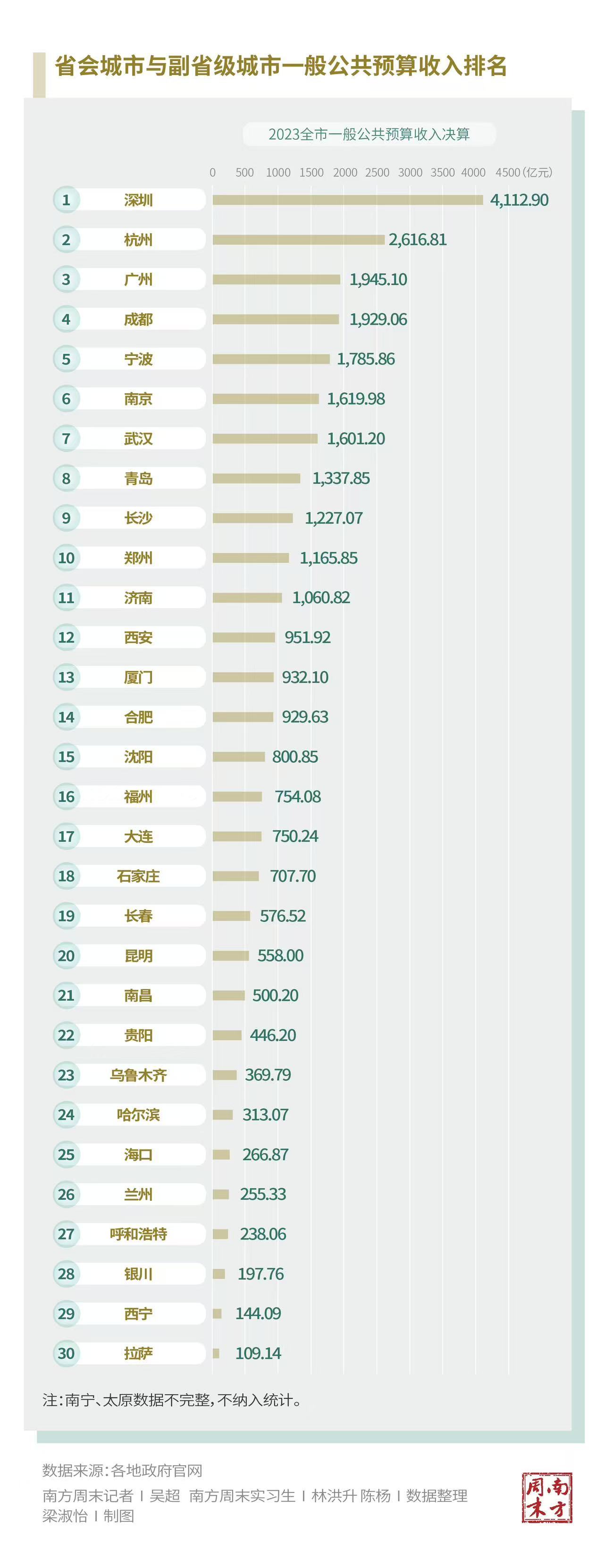 南方周末记者统计了北京、上海、重庆、天津四个直辖市之外,全国333个地级市、自治州、地区、盟(以下统称为“地级市”)的2023年度一般公共预算收入预、决算报告,探究地图上的财政现状。