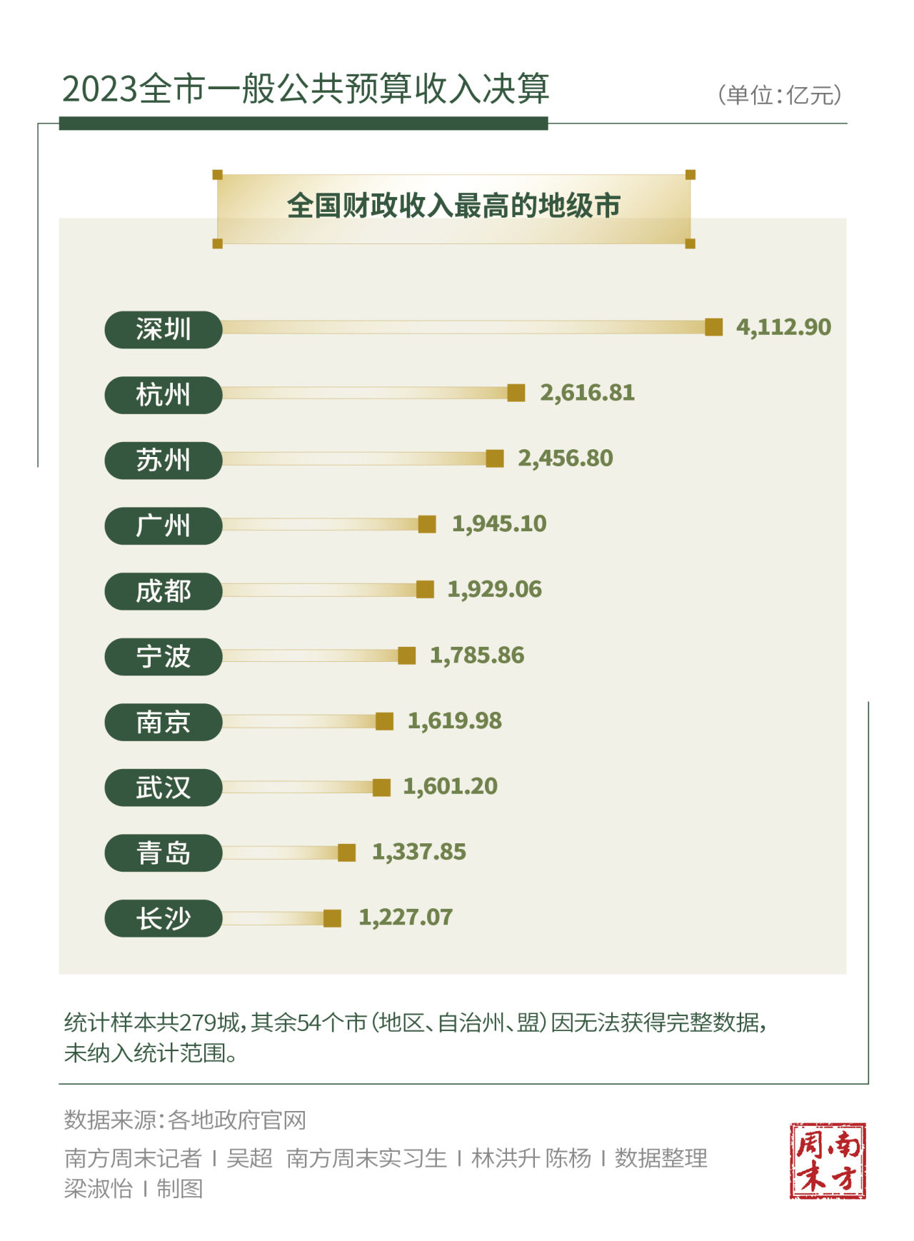 在279个城市的统计中,一般公共预算收入最多的,基本分布在东部沿海省份,前五位分别是深圳、杭州、苏州、广州、成都。