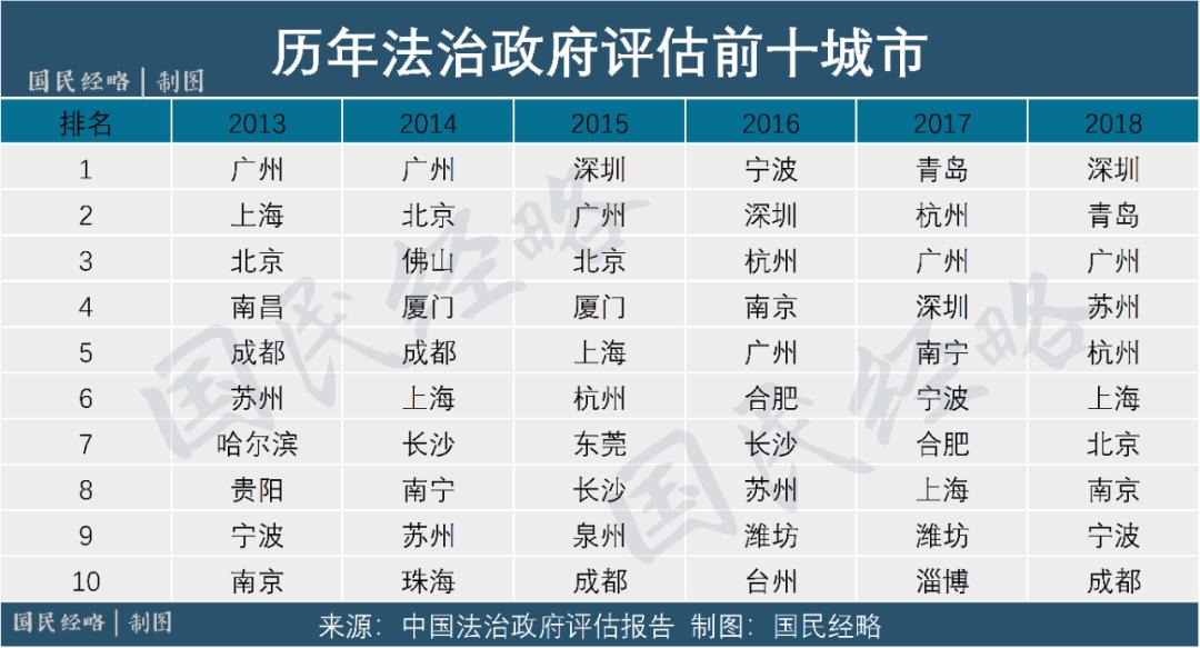 2015年至2019年,深圳在“中国法治政府评估“中名列前茅,其中3次荣获第一。2020年,中央依法治国办公布了首批法治政府建设示范市名单,深圳成为首批全国法治政府建设示范地区。