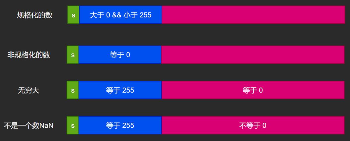 上面三种情况(第3种情况又分为两个子情况)可以参考下图。可以看出阶码E决定一个数是规格化的,非规格化的还是特殊值。