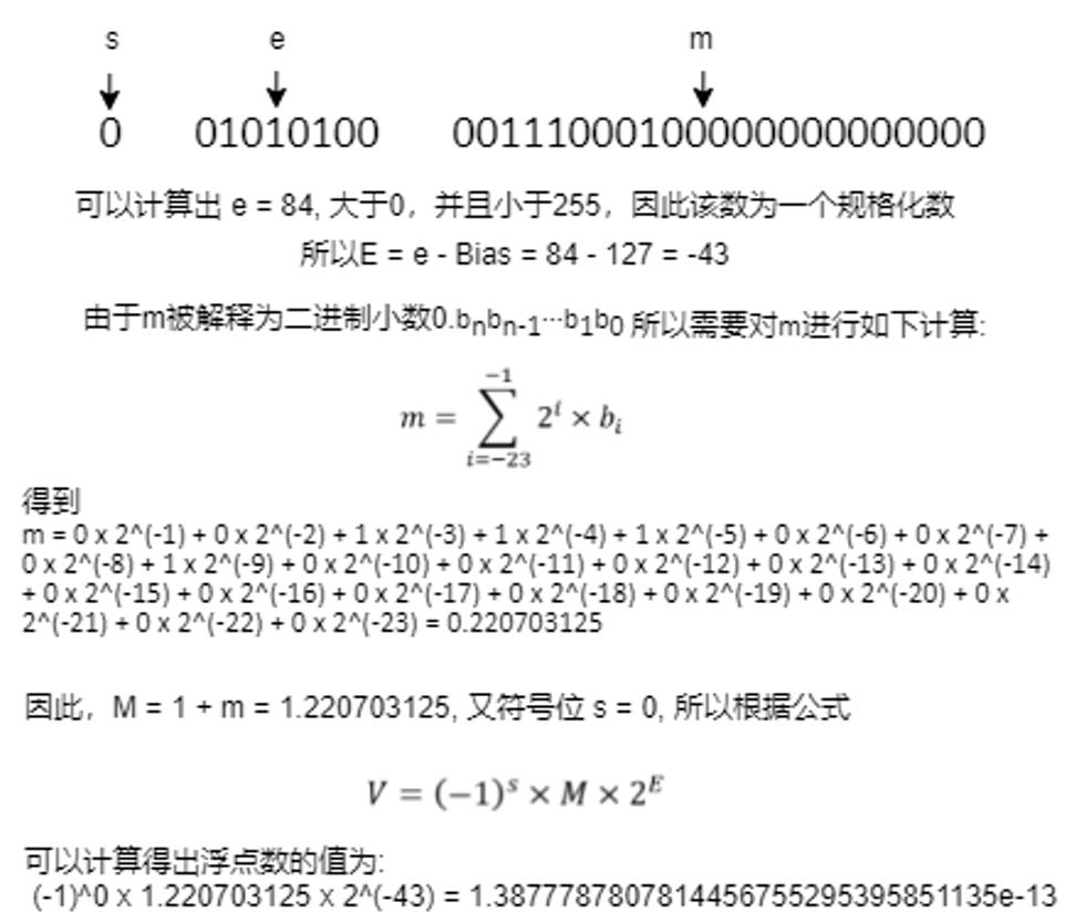 比如这里 有个32bits的二进制数00101010000111000100000000000000,那么它表示的浮点数是多少呢?根据前面的知识我们来进行下面的分析,32bits表示的是一个单精度的浮点数, 因此进行s, e, m三部分划分。下图展示了计算全部过程: