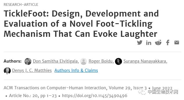 无论是大笑、微笑、还是抽搐到边躲边笑,总之,挠痒痒就像是被点了“笑穴”一样让被挠者不得不笑,就连最严肃的人也不例外。过去的心理学研究表明,在积极的社交互动中,引发大笑的搔痒(挠痒痒)可以显著缓解压力。此外,在家人、恋人和朋友(包括宠物)之间挠痒痒被认为是表达爱意的一种沟通方式。然而直到现在,仍缺乏关于挠痒痒如何对男性和女性产生影响的研究。近日,发表在《ACM Transactions on Computer-Human Interaction》上的一项最新研究中,来自德国吕贝克应用科技大学和新西兰奥克兰大学的研究人员填补了这一空白。早在1897年,美国两位著名的心理学家Granville Stanley Hall和Arthur Allin就提出了用两个术语knismesis和gargalesis来指代两种形式的搔痒。Knismesis是一种轻微的瘙痒,如来自指甲、羽毛、绒毛等轻柔触摸或昆虫踩踏,但它不会引人发笑;而gargalesis是触碰身体特定位置而产生的搔痒,它会引发身体剧烈的反应,会让受者发笑。后者需要一个不可预测和不可控的条件,涉及多个机械感受器和伤害感受器信号的整合。因此,gargalesis形式的搔痒是社交互动行为,这是一个人不可能完成的任务。众所周知,人体中最容易引发笑声的部位通常也是隐蔽的地方(不会被他人轻易触碰到),如脚底和腋窝。在这些位置中,脚底是更有趣的,因为脚底存在大量高度敏感的自由神经感受器、机械感受器、痛觉感受器等。在这项新研究中,研究人员首先设计了一个脚部搔痒装置,名为TickleFoot。它通过磁力驱动刷子刺激使用者脚的不同部位,以产生痒的感觉。然后,他们进行了两项实验,以确定脚底最痒的位置和能引起笑声的刺激模式。有13名参与者(7名女性和6名男性)测试了被TickleFoot搔痒的感觉,并使用李克特7点量表对脚底不同区域感受到痒的程度进行评分。在李克特7点量表中,5至7分为最高程度的痒,通常与“有趣”和“快乐”的感觉相关。结果显示,女性参与者的平均得分是5.57;而男性的平均得分是3.83。