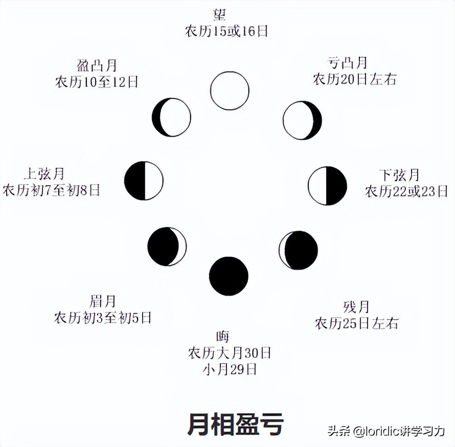 我们看图13、图14,农历初3-5,峨眉月,一阳初生,对应震卦;农历7-8,上玄月,二阳平,对应离卦;农历10~12,凸月,二阳盈,对应兑;农历15~16,满月(望),三阳纯,对应乾卦;农历20~21,凸月,一阴生,对应巽卦;农历22~23,下玄月,二阴平,对应坎;农历25~26,二阴盈,残月,对应艮;农历29~30,新月(塑),三阴纯,对应坤卦。