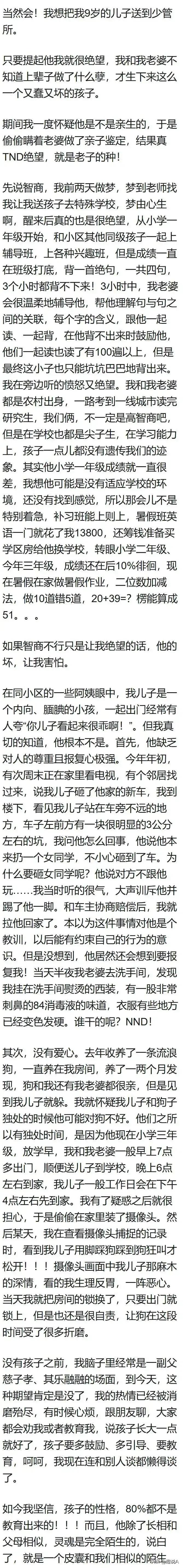 我记得有一位妈妈曾经对我说:"有天使就会有魔鬼,真的存在天生有问题的孩子,我记得超雄基因就是这样,智商低,暴力狂,身体强壮,破坏欲强,报复性强,没有任何同理心同情心道德心,小时候就会虐待小动物……"