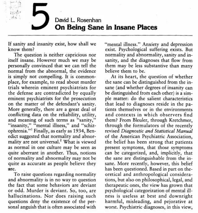 这7个人在精神病院待了几年,没有任何一个人被院方识破,这成了这项研究的一项关键发现,也是罗森汉恩的重要观点: