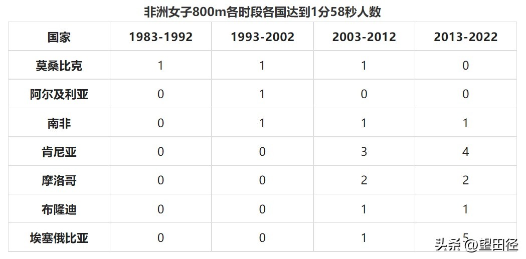 非洲区女子800米水平较高的地区主要集中在东部非洲、北部非洲和南部非洲,表格中所有国家都属于这个地区。从单个国家来看,肯尼亚、埃塞俄比亚和摩洛哥依靠近二十年的快速发展,是该项目在非洲的领头羊,而前期发展较好的国家则是莫桑比克;从非洲区整体来看,很明显地能看出,非洲区该项目发展从最开始一个国家一名运动员到了近十年五个国家十三名运动员,发展的广度和高度势头都非常好。