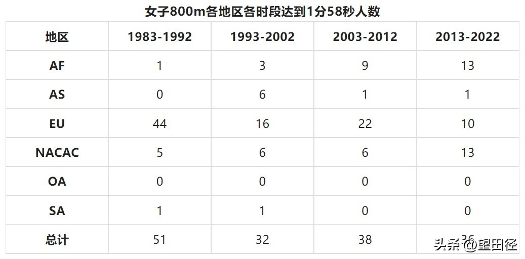 近四十年,女子800米在各个时段达到1分58秒的人数主要是一次大幅下降再加上后期的反复。从各个地区各时段达到1分58秒的人数来看,虽然在第二个十年经历了暴跌,但是欧洲区仍然是在前三个十年是人数最多的地区,而中北美及加勒比海地区则是最近十年人数最多的地区,非洲区在近十年则位居第二;从各个地区各时段达到1分58秒的人数比例来看,第一个十年,欧洲区比例处于绝对领先,在第二个十年和第三个十年则是在半数以上,而近十年却只能和非洲区与中北美及加勒比海地区一起各占1/3左右,可见欧洲区该项目的下滑和其他地区该项目的发展;从各个地区各时段达到1分58秒人数的增速看,相较第一个十年,非洲区明显是增速最快的地区,而在近十年,增速最快的则是中北美及加勒比海地区,另外,欧洲区则是有明显的下滑,近十年的人数不到第一个十年的1/4,不到上一个十年的1/2,下滑比较明显。从各时段总计达到1分58秒的人数来看,总体在前两个十年经历了一个下滑期,然后在近三十年就一直在这个水平反复,难以达到前十年的辉煌期;总体来看,最近十年达到1分58秒的人数只有第一个十年的2/3左右,发展明显遇到了瓶颈。