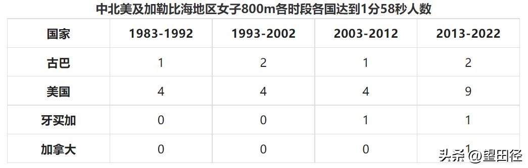 中北美及加勒比海地区女子800米发展水平较高的地区集中在北美以及加勒比海的西北部,所有国家都来自这些地区。从单个国家来看,发展最好的国家无疑是美国,该国在每个十年至少有四位运动员达到1分58秒,近十年更是人才井喷,有接近十名运动员达到这一水平,另外一个发展不错的国家则是古巴,每个十年都能有运动员达到这一水平;从中北美及加勒比海地区整体来看,虽然只是从一开始两个国家五名运动员达到1分58秒变成了四个国家十三位运动员达到这一水平,发展广度和高度没有那么迅速,但是至少每个十年都基本在增长,而近十年达到了顶峰,该项目在该地区发展的势头非常凶猛。