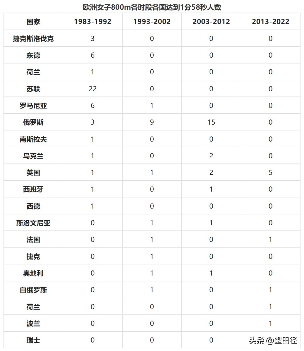 欧洲区女子800米发展水平较高的地区非常分散,除了北欧地区,其他所有地区都分散有出色的运动员和发展不错的国家。从单个国家来看,在第一个十年,苏联该项目的发展水平极高,超过了二十名运动员达到1分58秒,而罗马尼亚和东德也有超过五名运动员达到这一水平,到了第二个和第三个十年,俄罗斯则在欧洲区一枝独秀,第三个十年甚至有多大十五名运动员达到1分58秒,近十年,欧洲区发展最好的国家则变成了英国,英国依靠近年来该项目出色的发展,达到1分58秒这一水平的运动员人数已经占了欧洲区半数;从欧洲区整体来看,从第一个十年有十一个国家四十四名运动员达到1分58秒,到现在只有六个国家十名运动员达到这一水平,发展高度和广度都有大幅下滑,欧洲区还需要通过努力恢复昔日荣光。