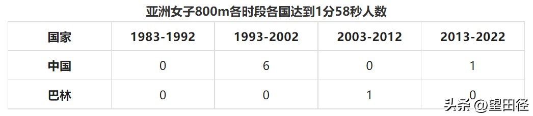 亚洲区女子800米水平发展一般,只有两个国家有过运动员达到1分58秒。从单个国家看,中国明显是发展最好的国家,但是主要集中在第二个十年,近年来也只有一位选手能达到这个水平;从亚洲区整体来看,很明显地看出,该项目自第二个十年发展到顶峰之后再也没有达到太高的水平。