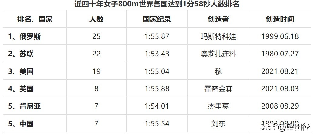 从近四十年国家女子800米的水平来看,俄罗斯、苏联和美国三国位居前三,并且达到1分58秒的运动员人数都差距不大,广度上俄罗斯领先,高度上苏联领先,美国稍微有微小的差距。欧洲区近十年该项目发展势头凶猛的英国排在第四位,而非洲最强的国家肯尼亚则位居第五。中国依靠在第二个十年的出色成绩,总共有七名运动员达到1分58秒,在第二个十年有六位,分别是刘东、曲云霞、刘莉、王媛、郎营来和吕亿,而最近十年则出现了王春雨达到这一水平,中国依靠这七位运动员与肯尼亚并列第七,但是可以看出,中国该项目发展水平高的时期集中在上世纪末,本世纪发展缓慢,但是近几年王春雨的出现带来了惊喜,我们也需要更多运动员来是该项目得到更快的发展。