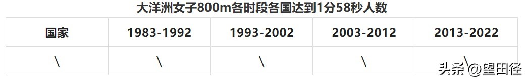 大洋洲区女子800米发展水平很一般,至今没有运动员达到1分58秒。